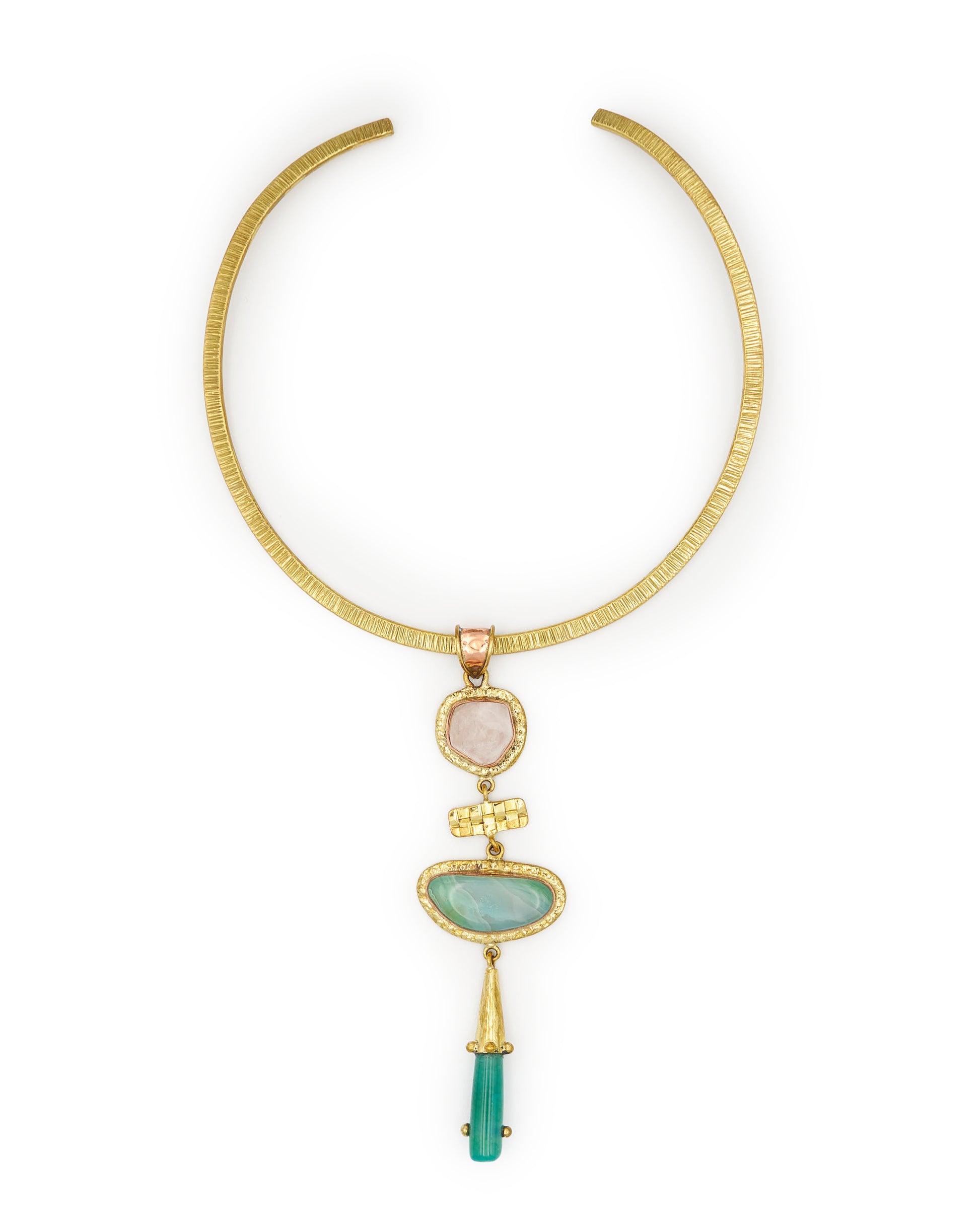 A carved torque frames a cascade of cool-toned gems: soft rose quartz, a glimmering aquamarine, and a vivid blue-green column, anchored by geometric gold. A modern relic with ancient soul.