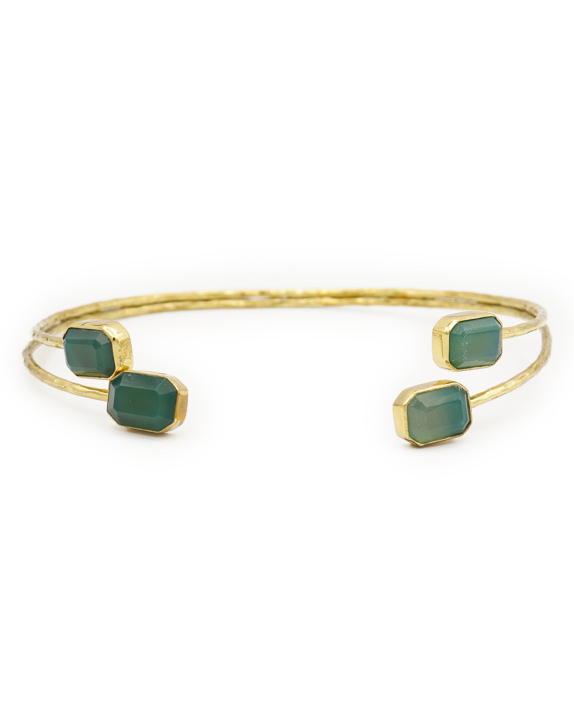 A striking gold choker adorned with deep green stones — sculptural, elegant, and full of character.