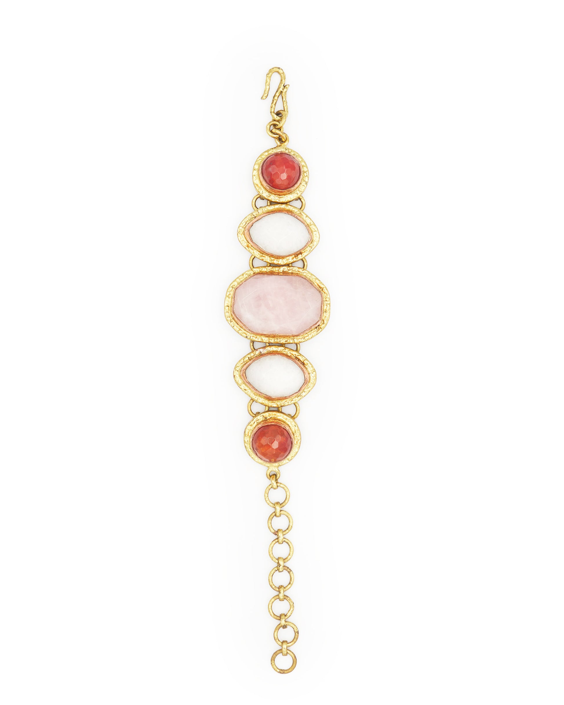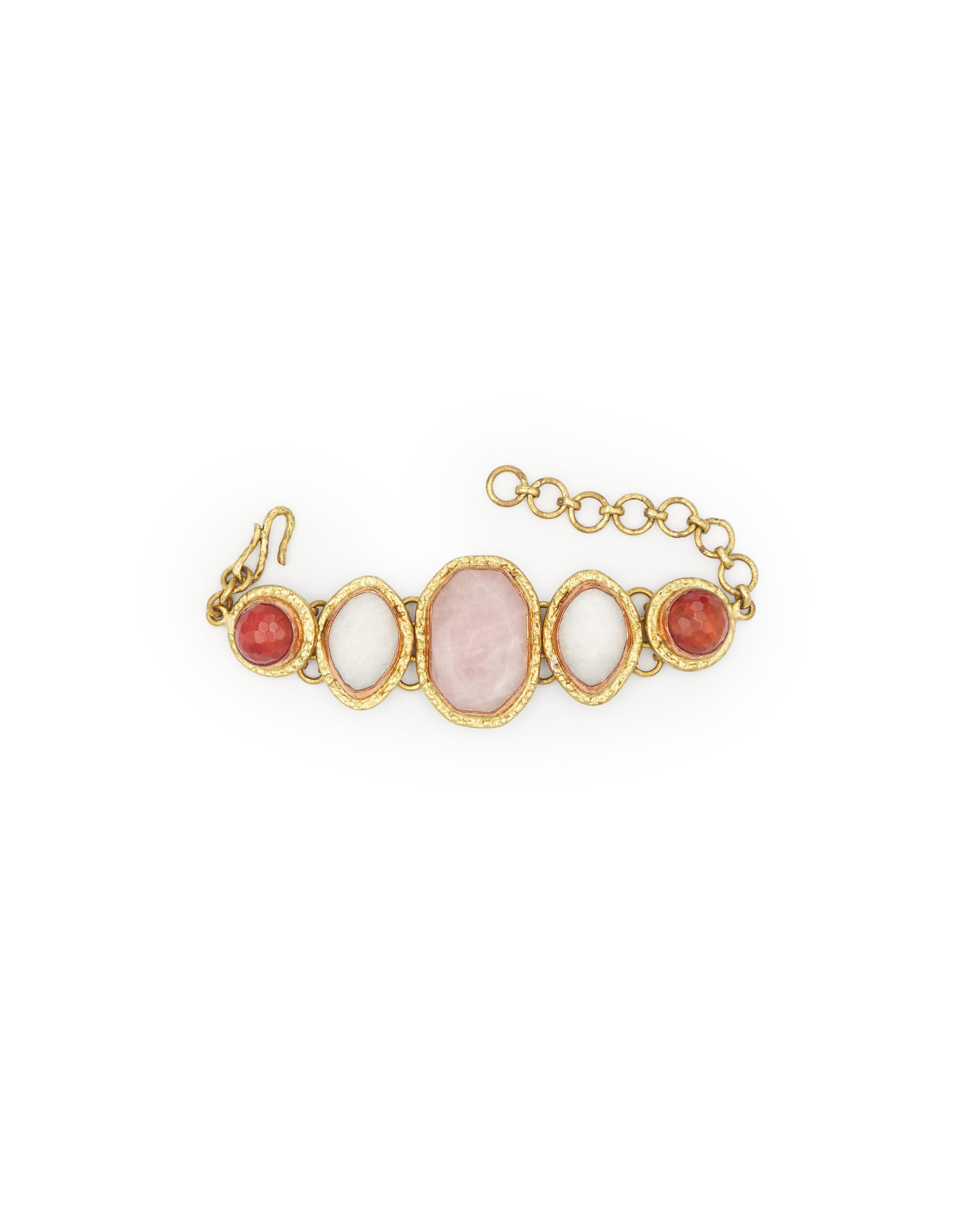 A delicate gold bracelet with faceted stones in shades of rose, coral, and soft white — like a sunrise melting into morning light. Romantic, warm, and effortless.