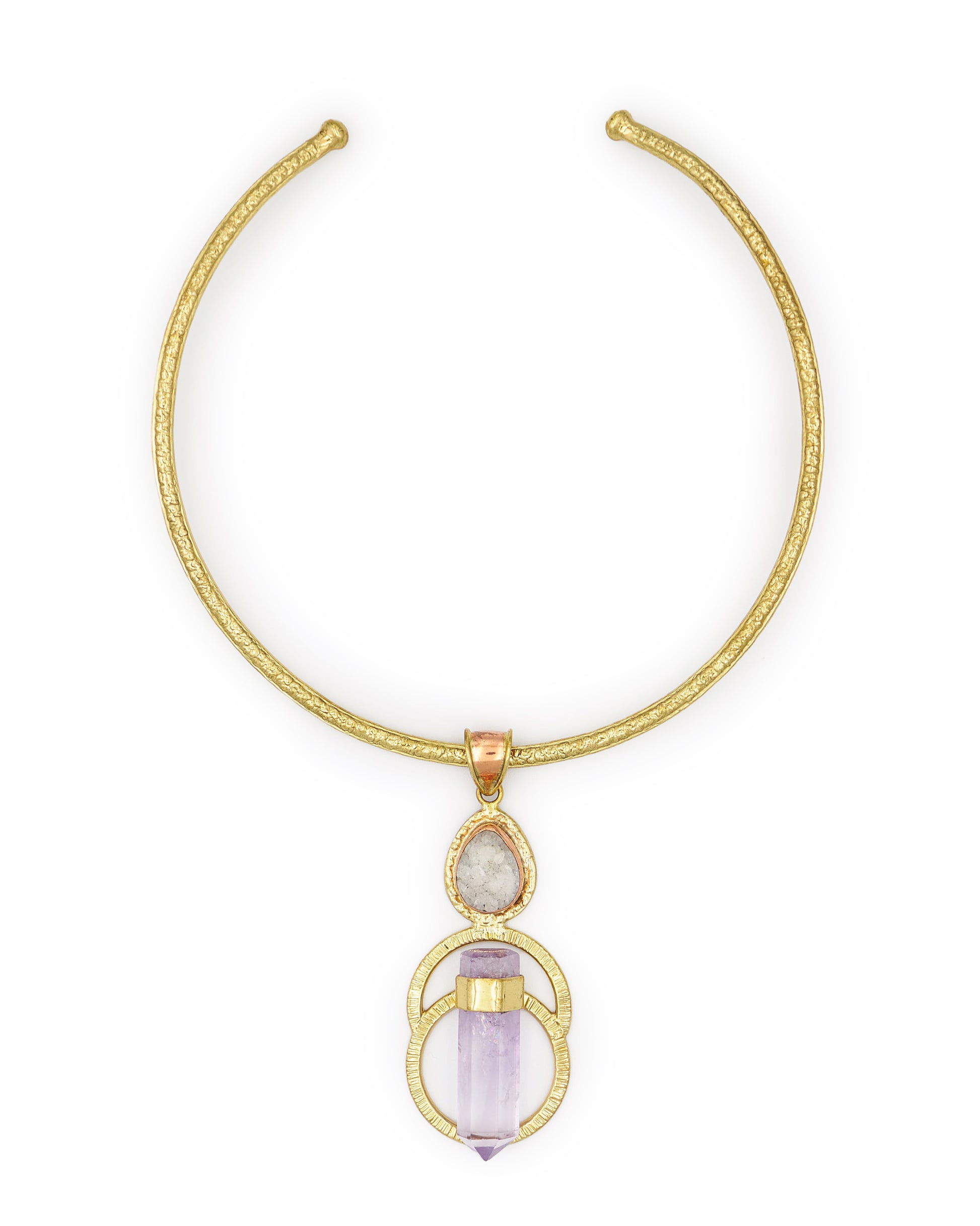 A textured gold necklace adorned with a clear grey teardrop stone above a faceted lavender crystal framed in interlocking golden circles.