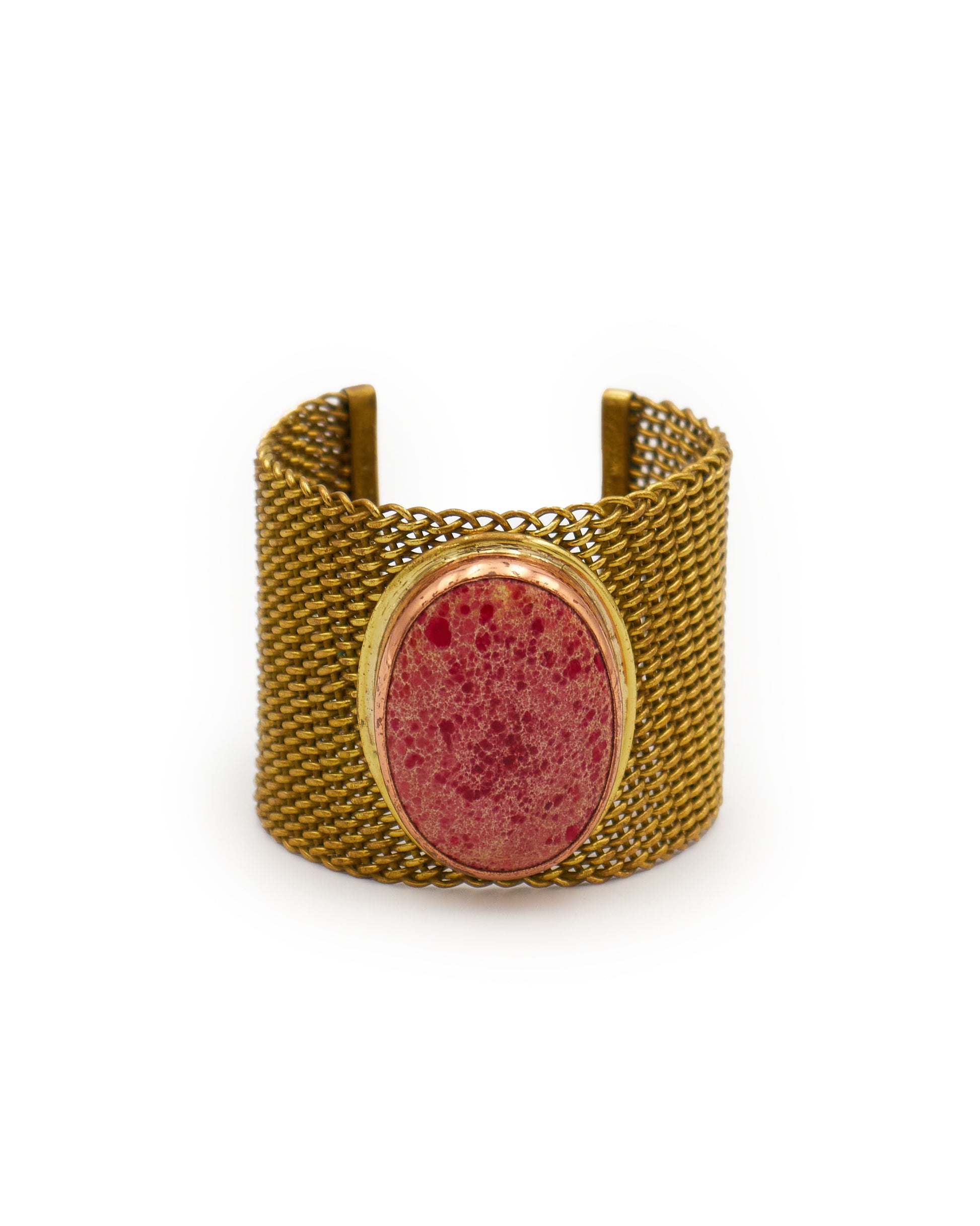 A golden mesh cuff featuring a juicy red oval stone with speckled texture — bold, playful, and made to pop with any outfit.