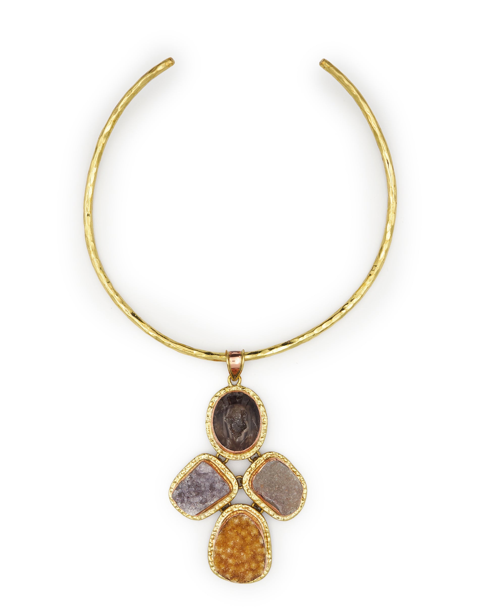 A hammered gold necklace featuring five natural stones in burnt orange, grey, and soft lavender, arranged in a sculptural floral silhouette.