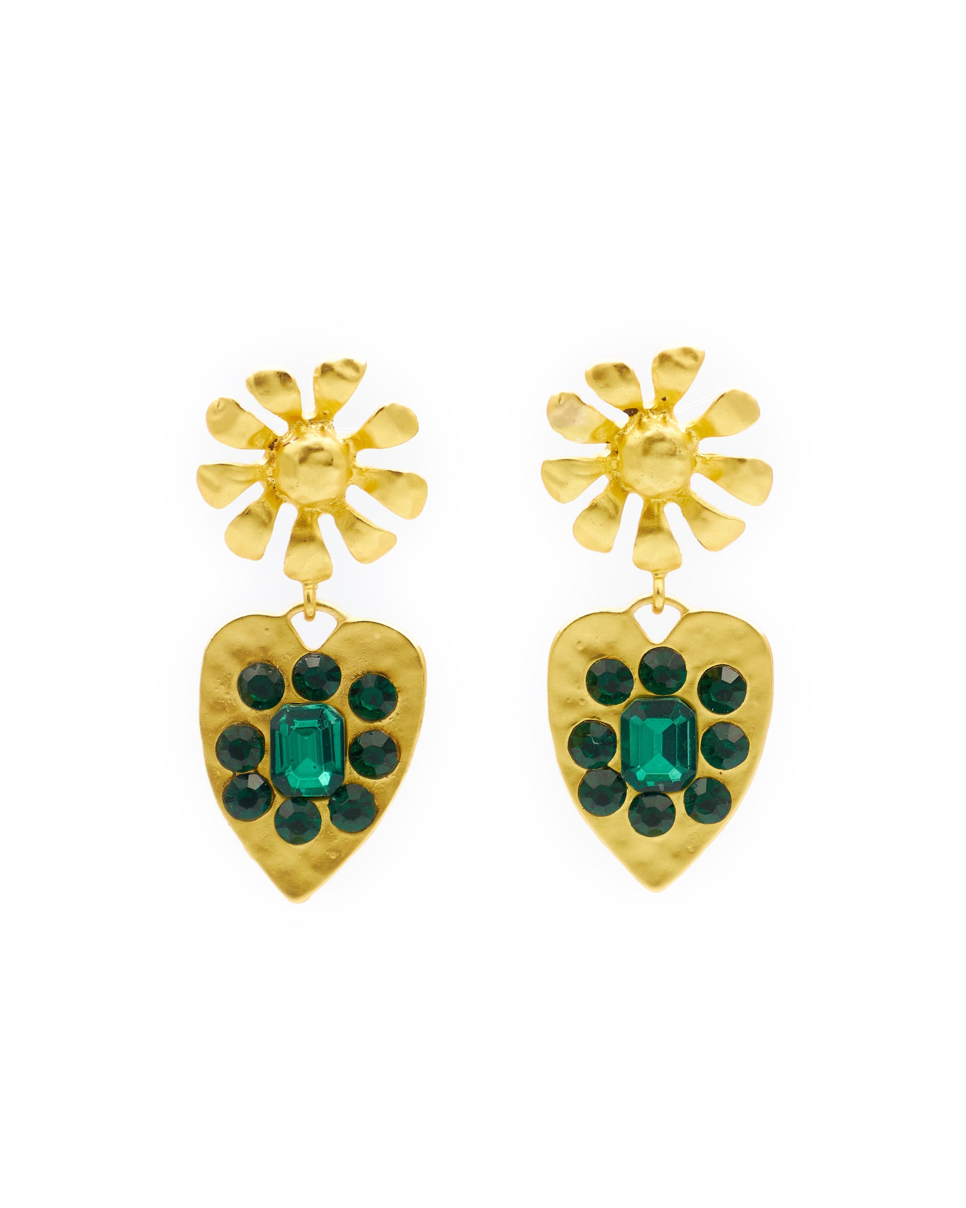 Golden floral studs bloom into hammered heart drops, sparkling with vivid emerald-green crystals. A playful, powerful piece made to shine day or night.