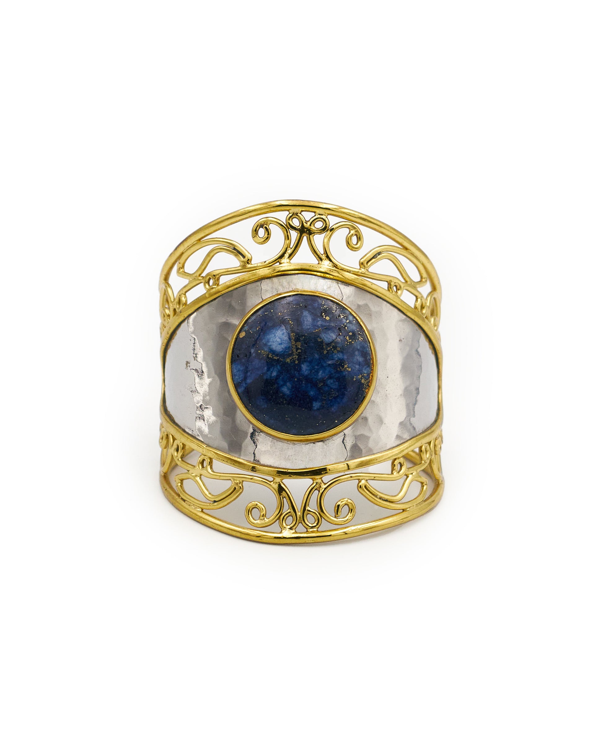 A striking open cuff with a hammered silver center, adorned with a deep blue accent and framed by delicate golden filigree. Elegant and full of character.