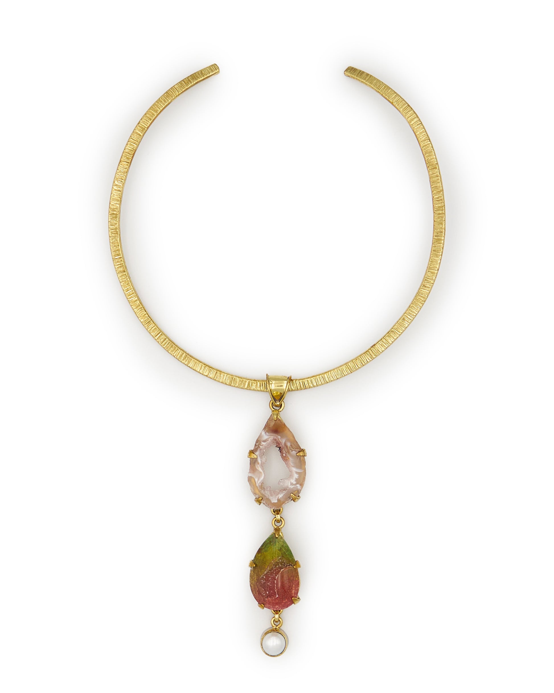 A sculpted gold torque holds a trio of treasures: a sliced pink agate, a two-toned green and rose tourmaline, and a single luminous pearl — like dew suspended beneath wild petals.