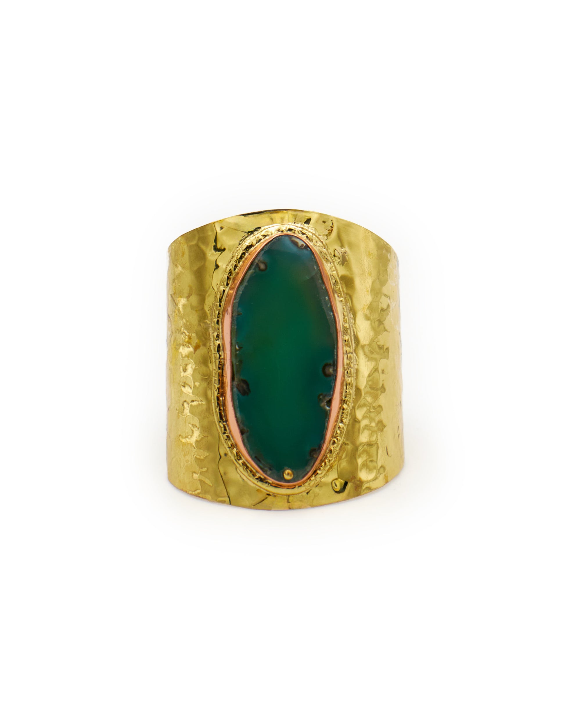 This hammered gold cuff wraps your wrist in wild charm, with a glowing green center like a hidden garden gem.