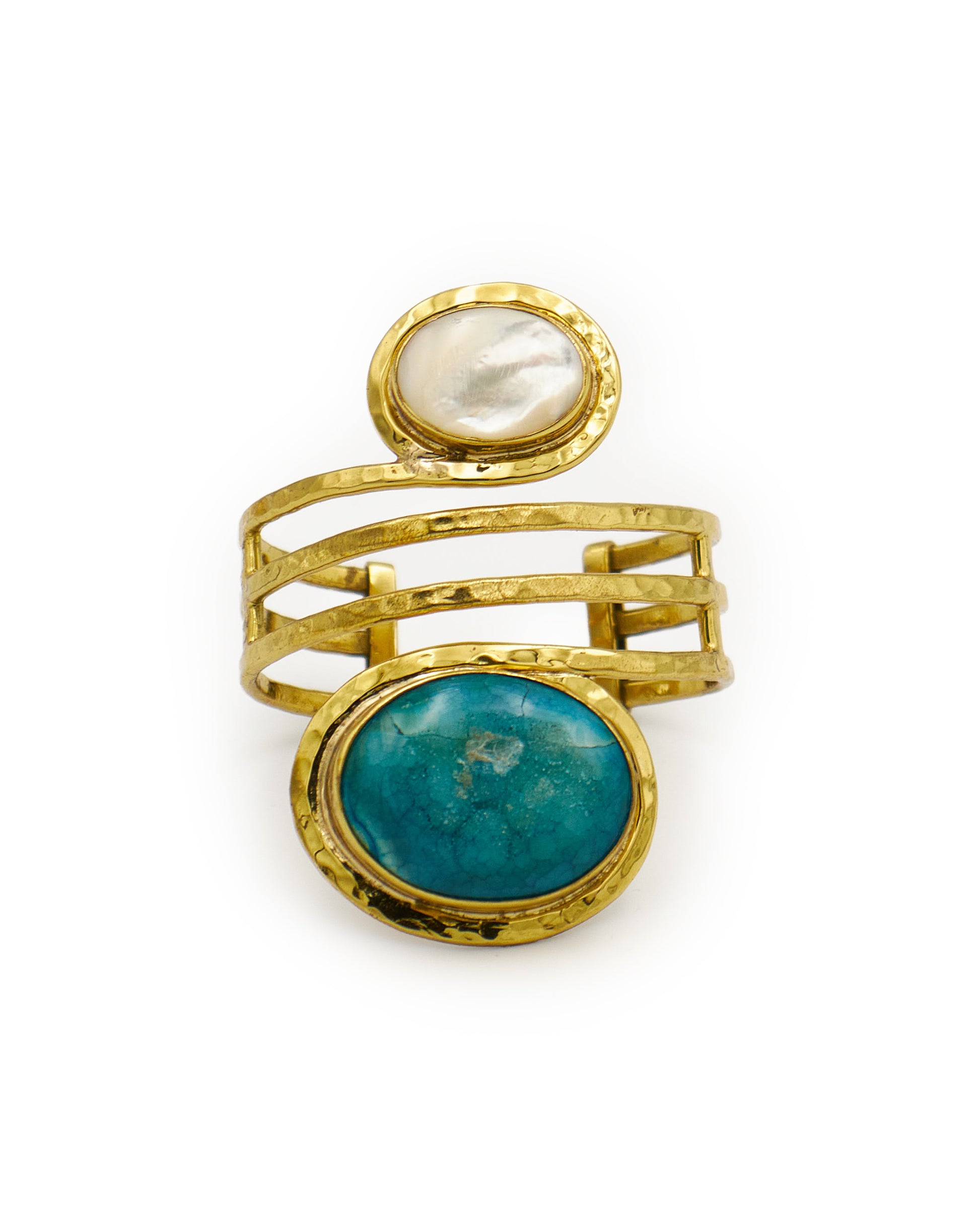 An open gold cuff with a striking mix of elements — a luminous pearl-like accent above a vibrant ocean-blue centerpiece. A bold design inspired by moonlight over the sea.