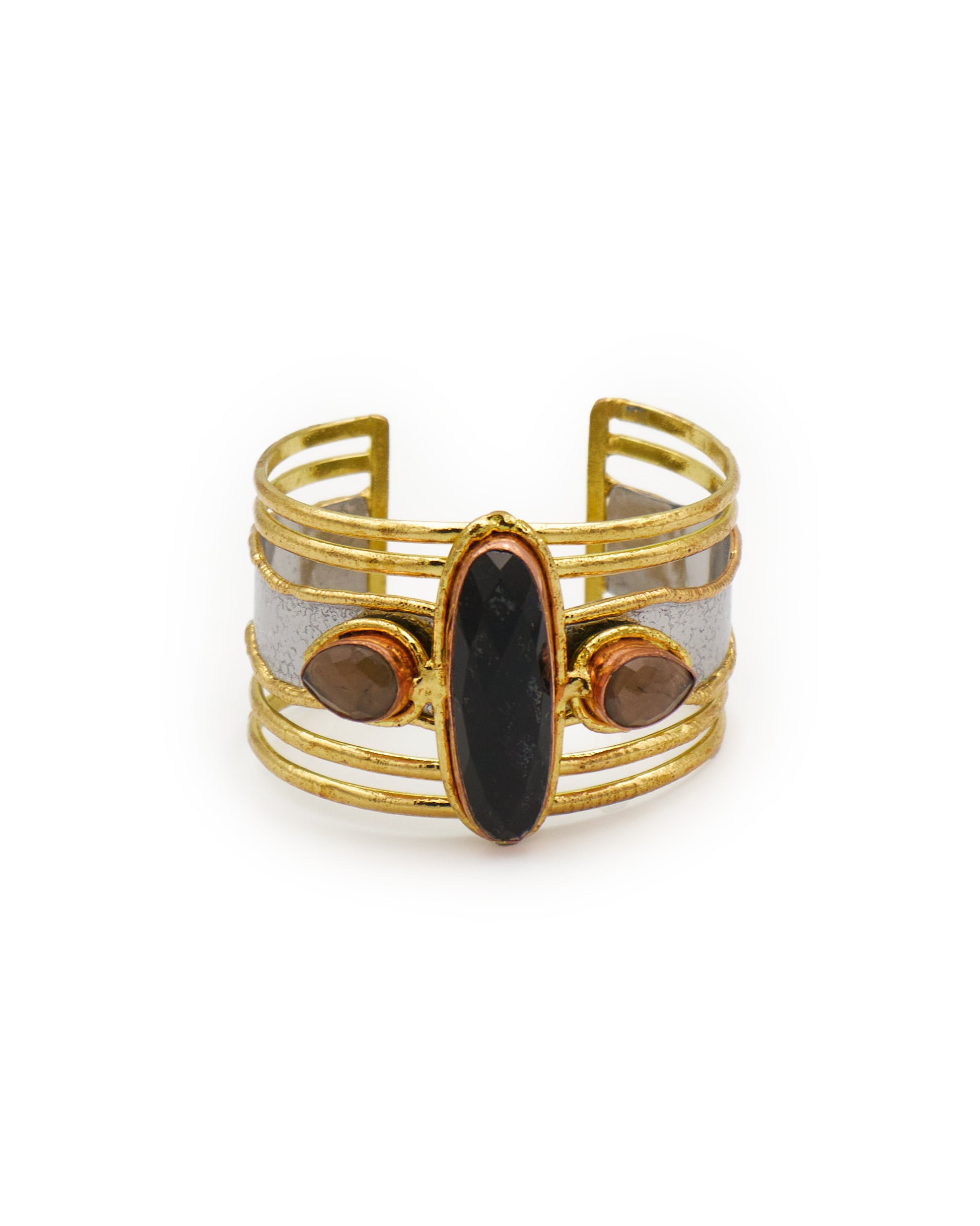 A structured gold and silver-tone cuff featuring a long, faceted black centerpiece flanked by warm brown gems — a powerful contrast of shadow and light.