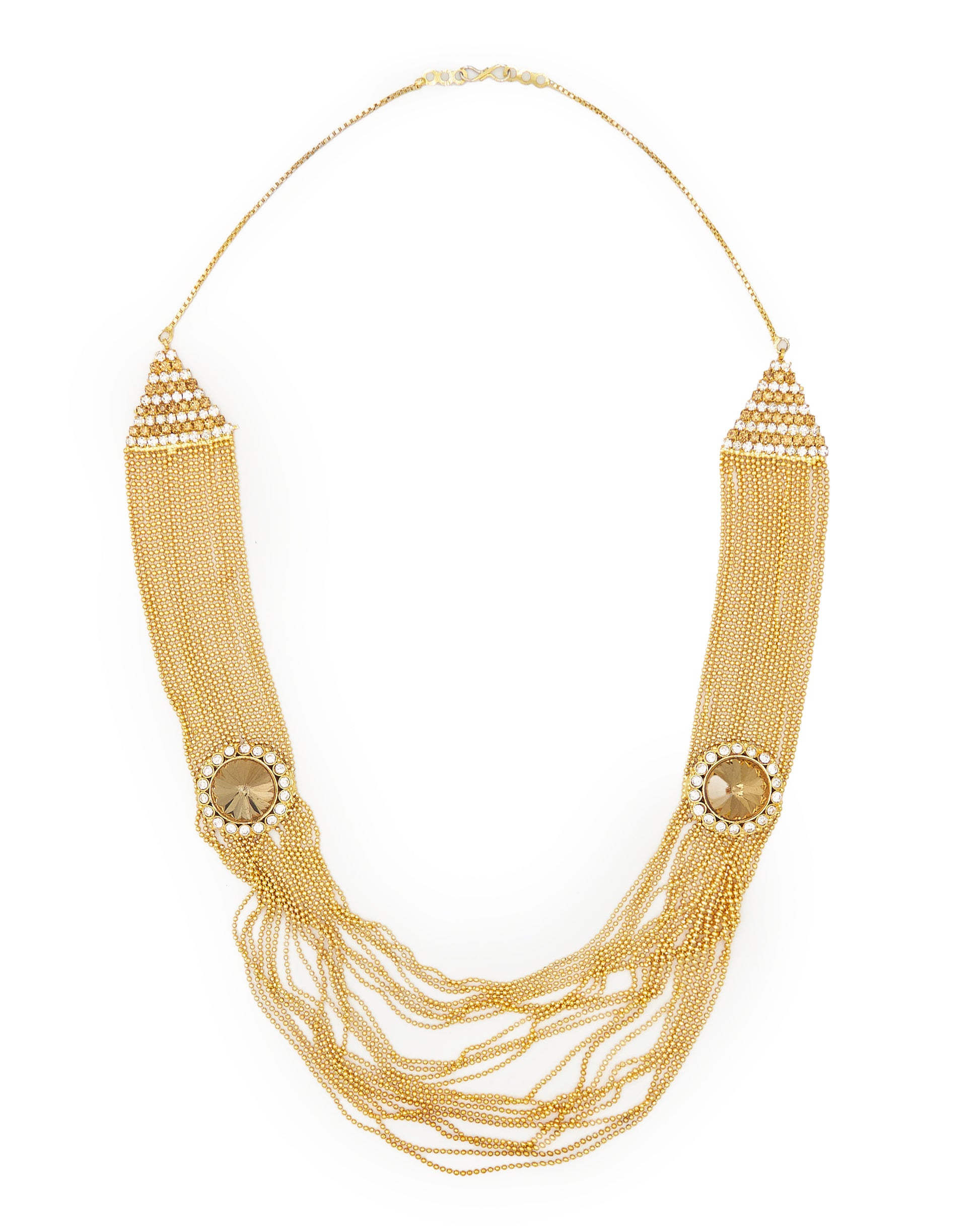 A statement necklace with cascading strands of fine metallic beads, crowned by radiant sunburst medallions and sparkling crystal accents. Bold, fluid, and made to dazzle.