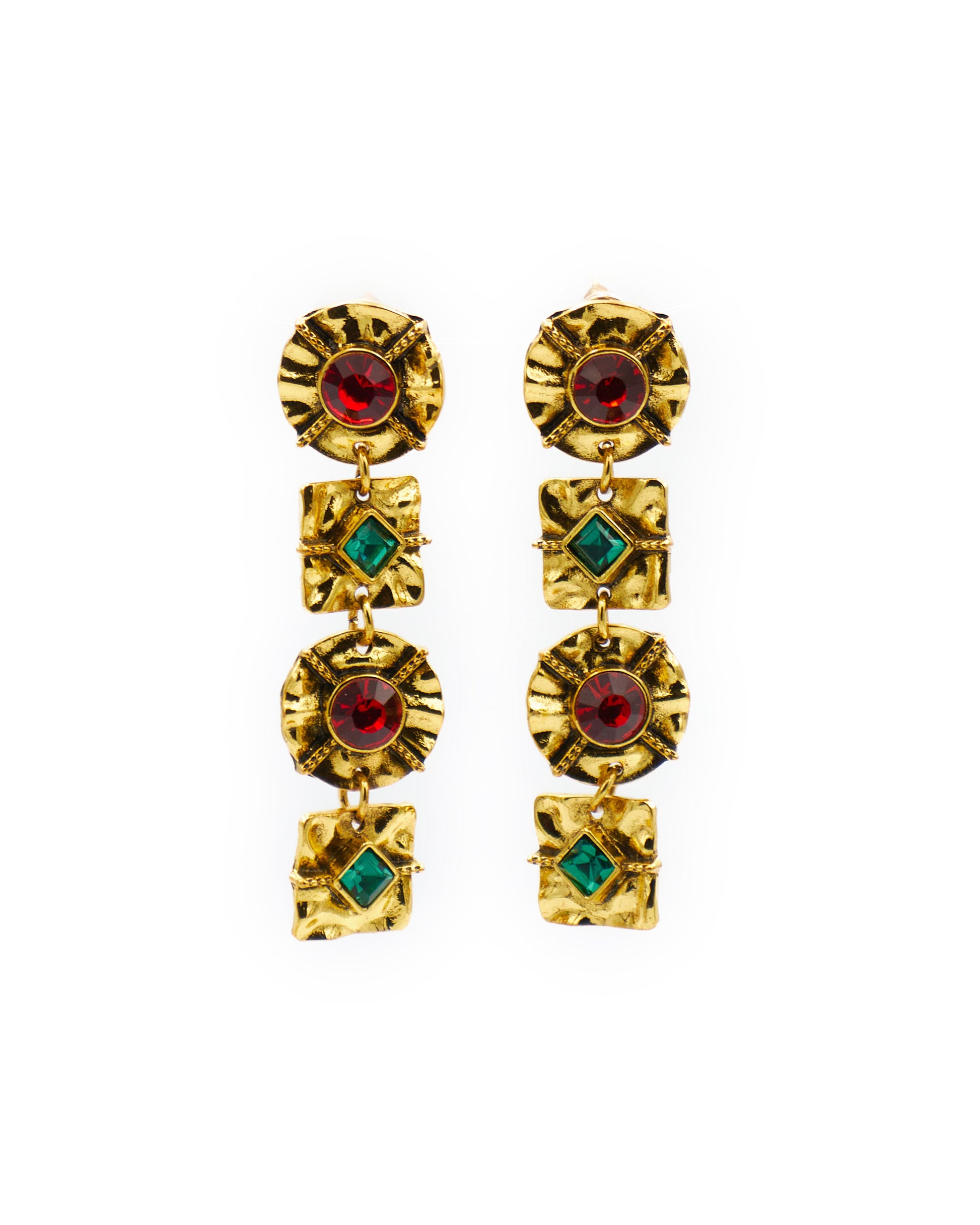 Rich with texture and jewel tones, these antique-style gold drops feature ruby-red and emerald-green stones in sculpted, molten-like frames. A statement fit for a modern empress.
