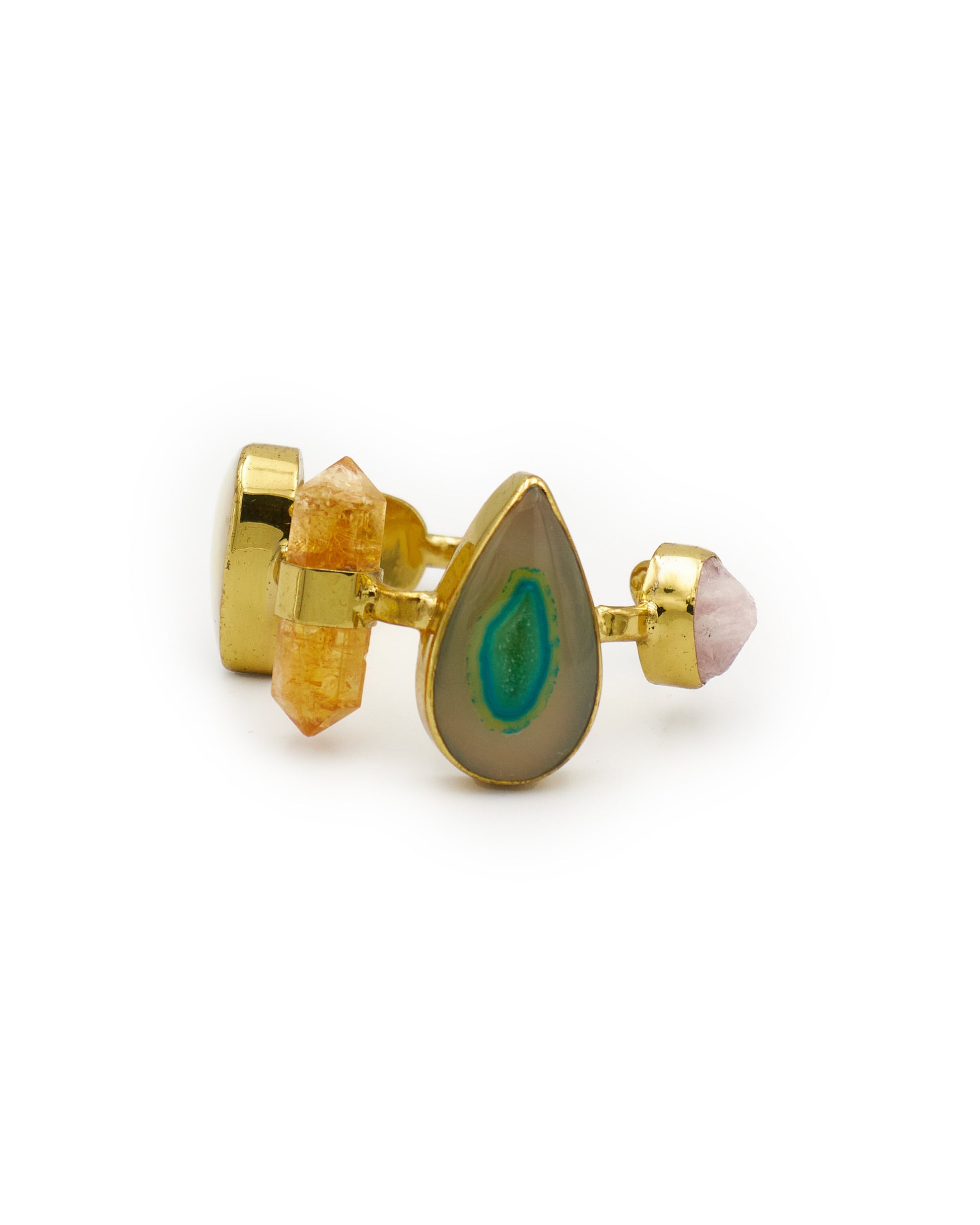 A gold-toned bracelet featuring a striking mix of stones—citrine point, green agate, and luminous mother-of-pearl. A radiant, bohemian piece with a raw mineral charm.