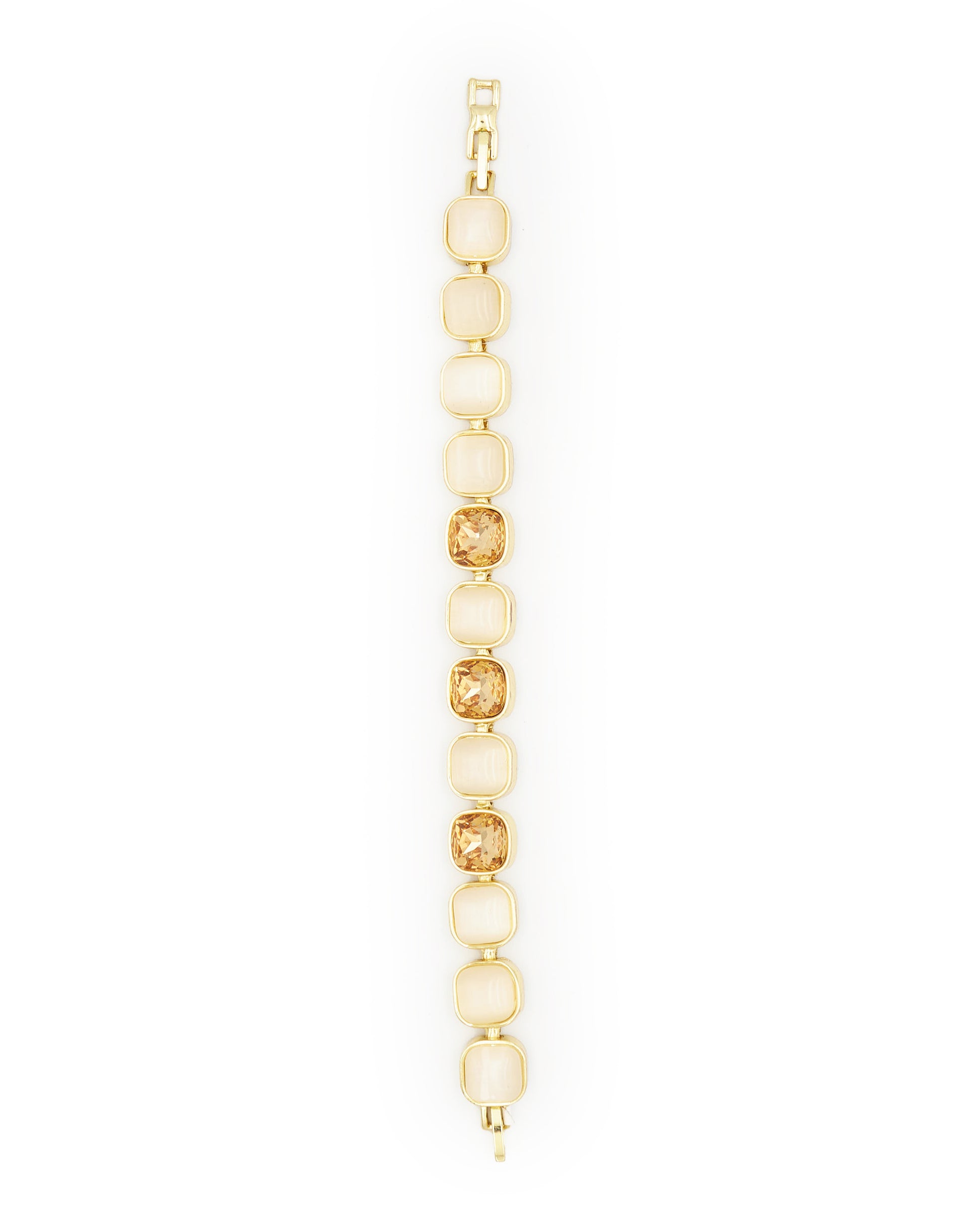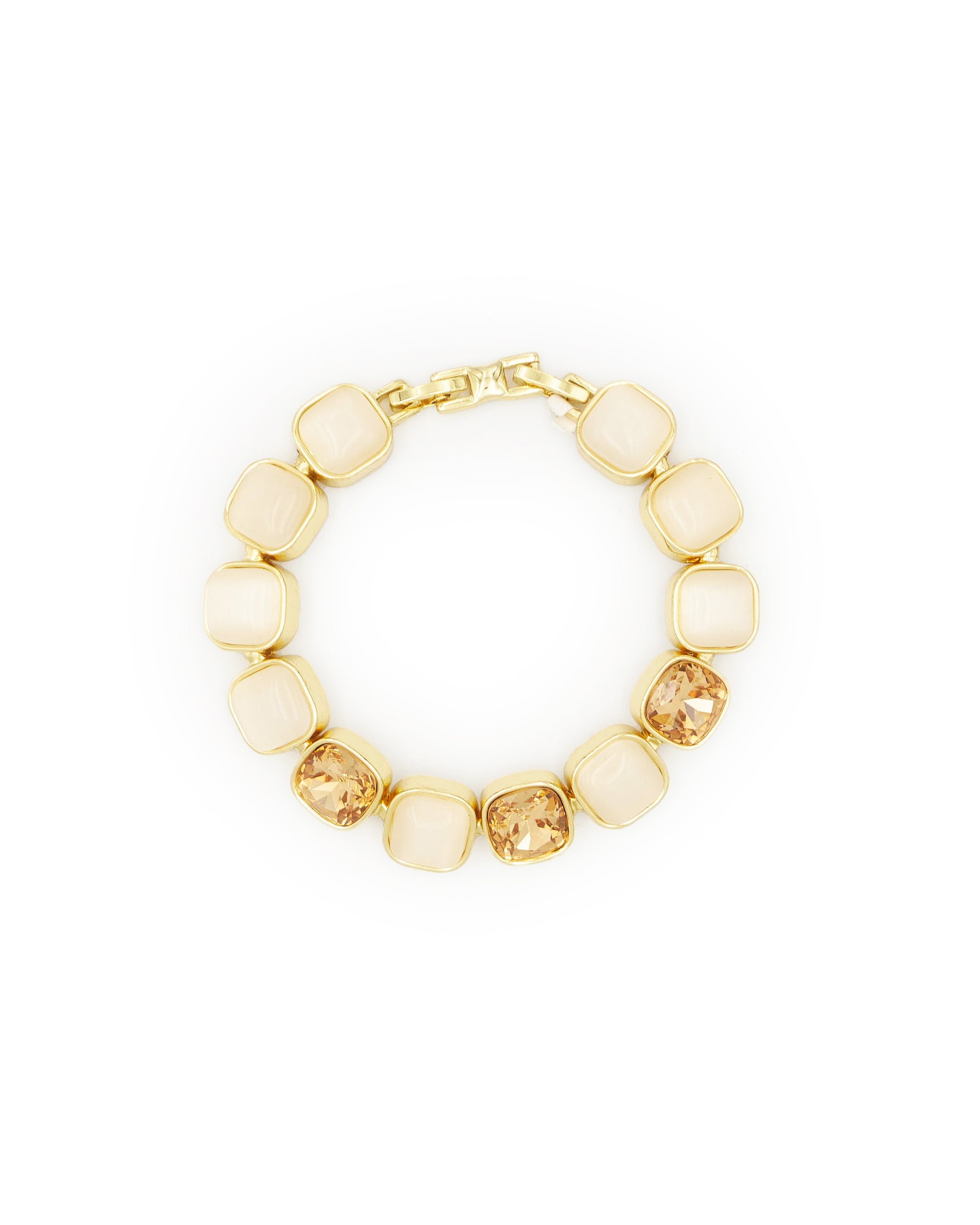 Elegant and polished, this bracelet pairs milky blush squares with sparkling golden crystals — a delicate blend of softness and shine for your most radiant days.