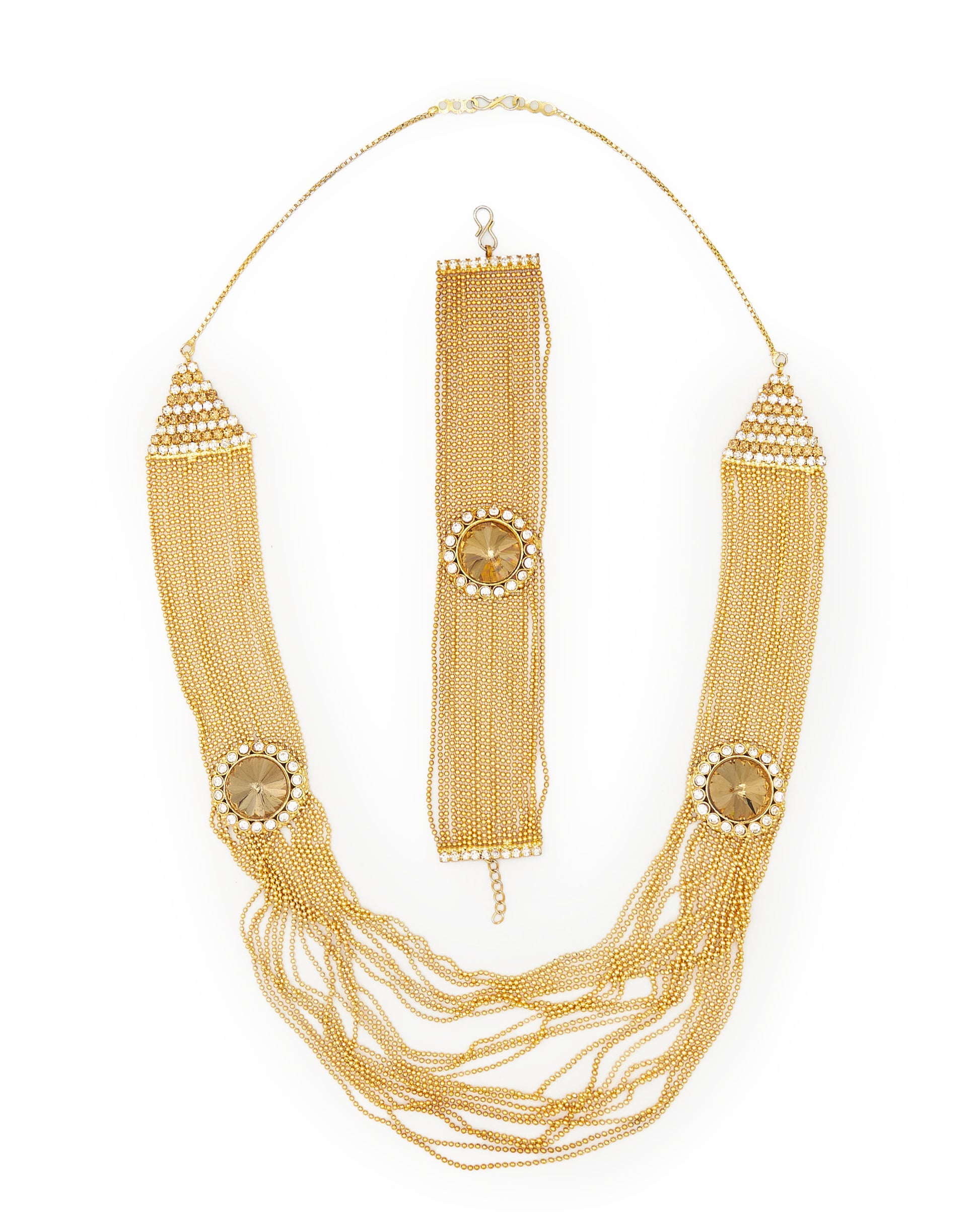 A radiant set featuring layered metallic chains and medallion accents framed with shimmering pearls. Designed to command attention — from gala nights to power poses.