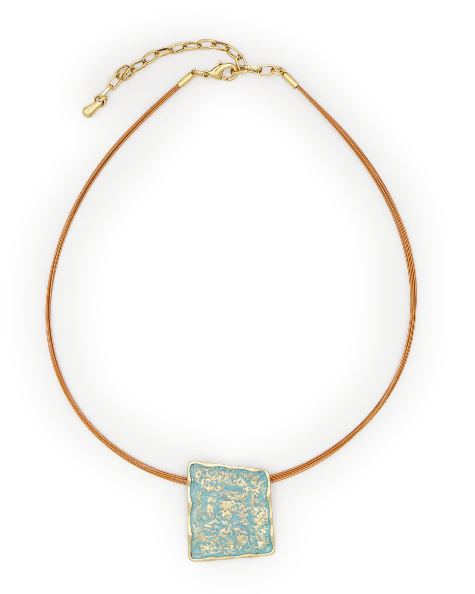 A copper-toned necklace with a square pendant in a blue-green verdigris shade, accented with gold texture for an antique, artistic feel.